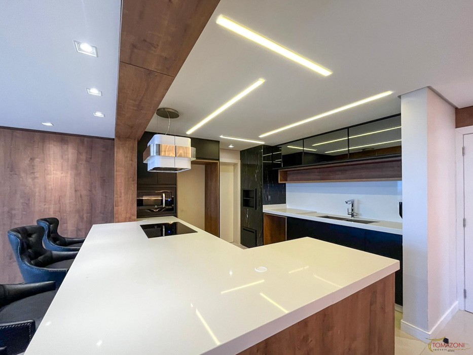 - Bar revestido com pedra granito Via Lactea escovado e 6 portas com amortecimento e em vidro reflecta fumê, espaço para adega e cervejeira e garrafeiro lateral e iluminação em LED;