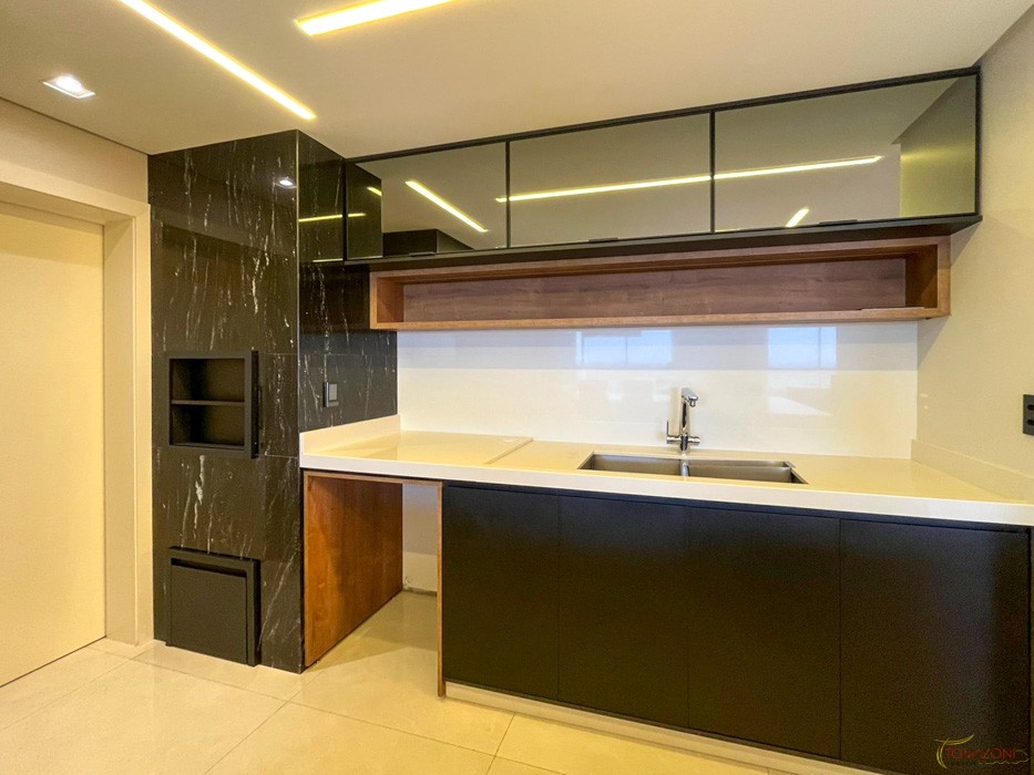 - Balcão com 3 Portas em MDF preto com amortecimento toalheiro e gavetas para utensílios na parte interna e espaço para embutir lavadora de louças;