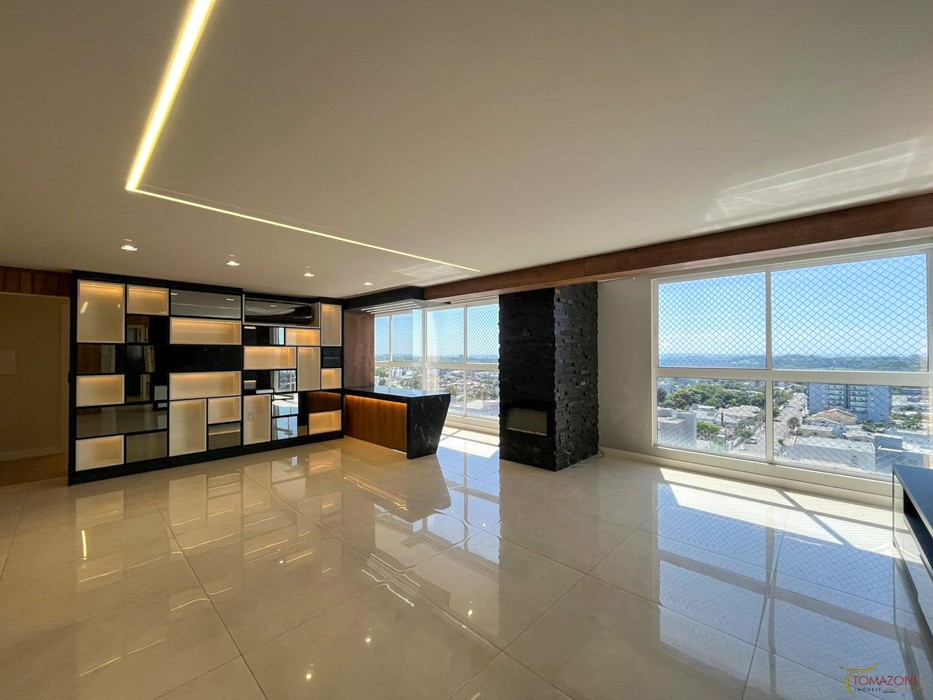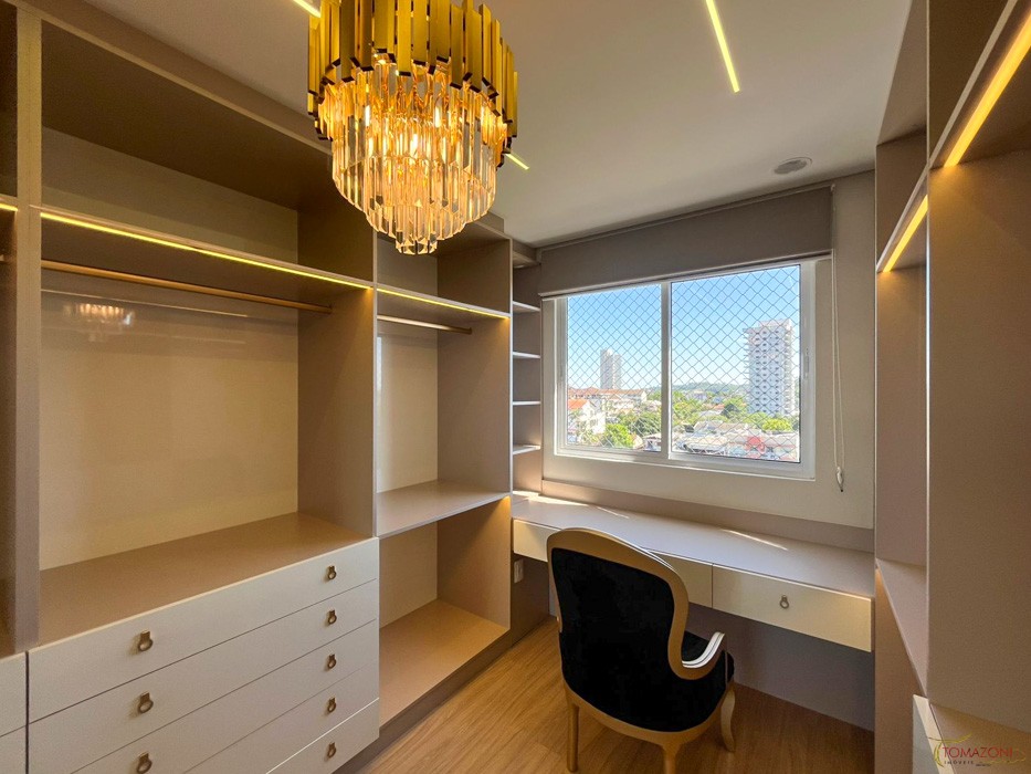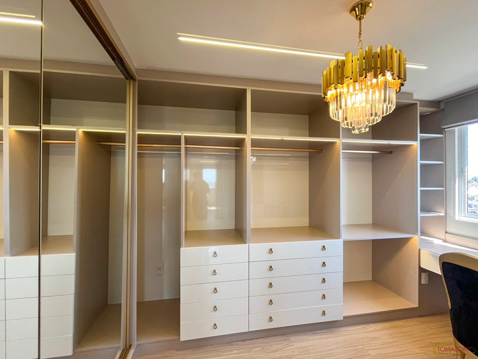 - Armário em MDF laqueado e alto brilho com 15 nichos e 13 portas em espelho fumê;