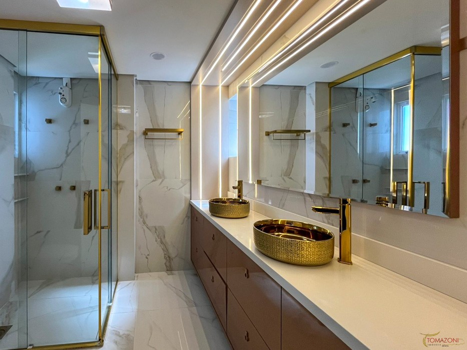 - Box de vidro temperado até o teto com detalhes em dourado;