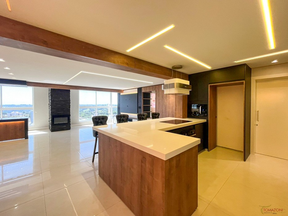 - Bancada em MDF amadeirado com 4 portas com amortecimento e porta temperos e gavetas para utensílios na parte interna. 2 tomadas embutidas. Pedra quartzo branco;