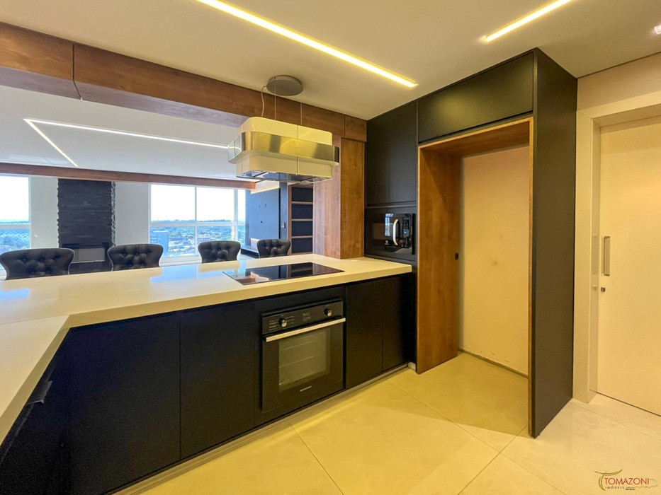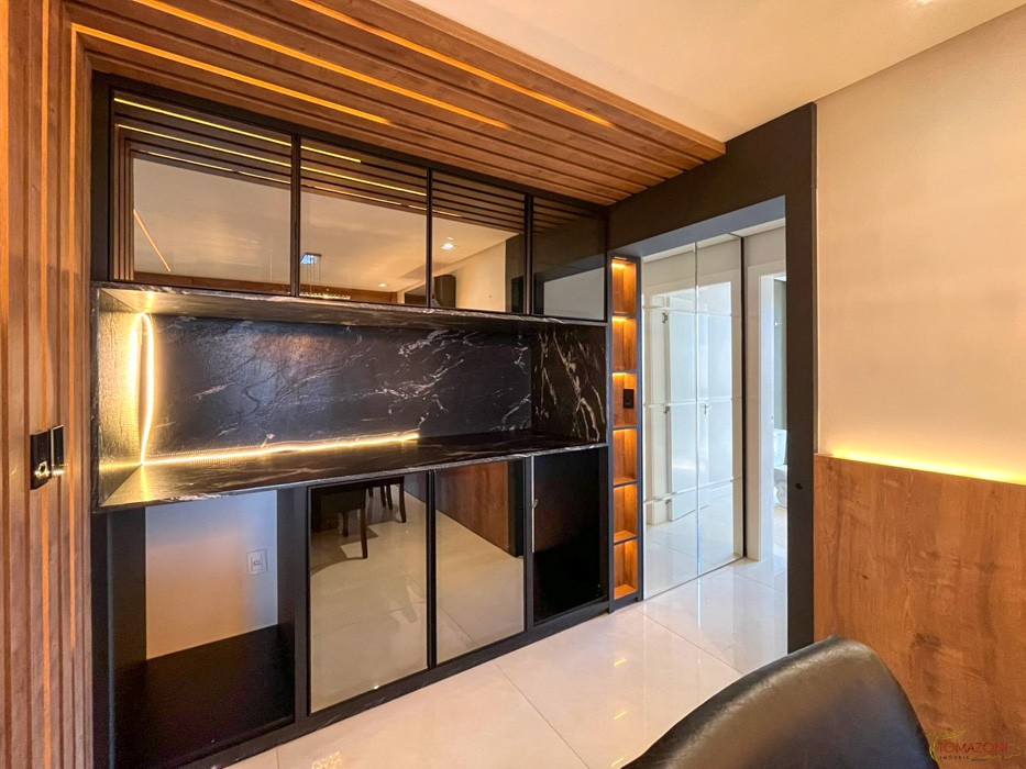 - Bar revestido com pedra granito Via Lactea escovado e 6 portas com amortecimento e em vidro reflecta fumê, espaço para adega e cervejeira e garrafeiro lateral e iluminação em LED;